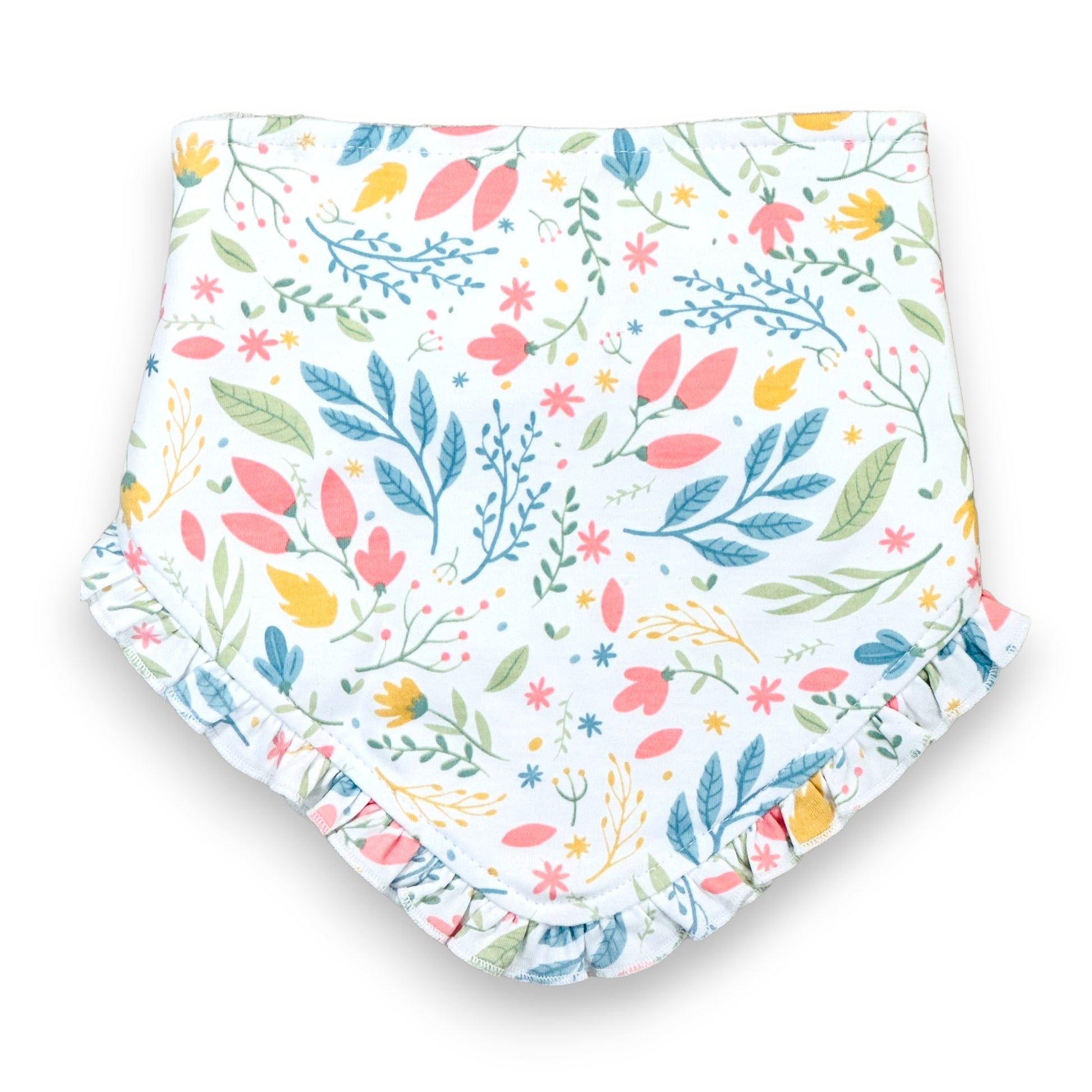 Babero tipo bandana con vuelos estampado con nuestro diseño floreado.