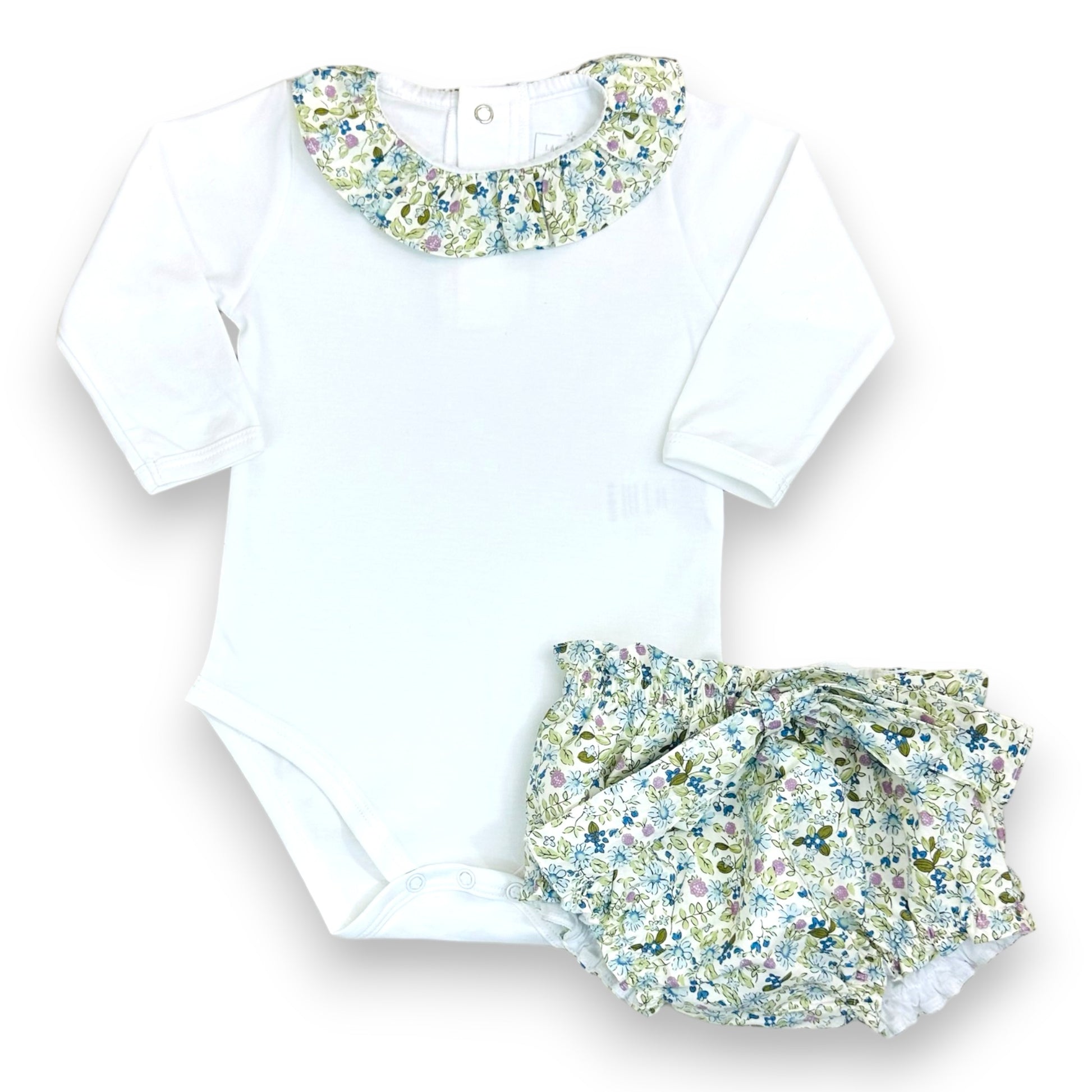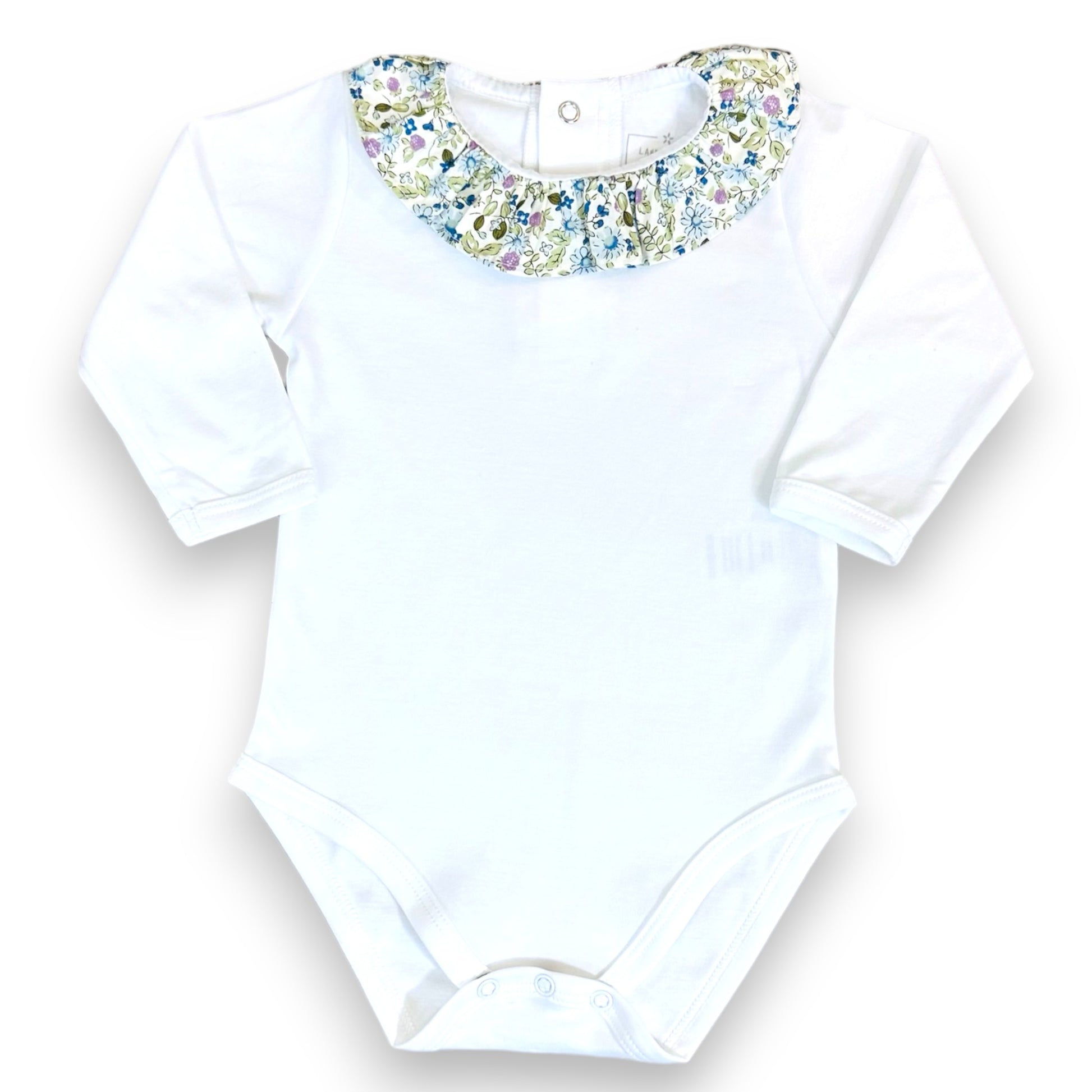 Este body de manga larga combina la suavidad del algodón pima con un vuelo floreado estampado Jardín Esmeralda de popelina. Ideal para combinar con el cubrepañal del mismo diseño.