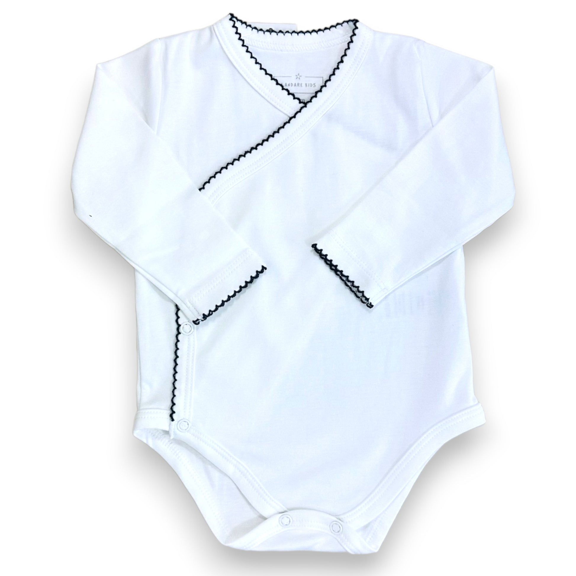 Body cruzado hecho 100% en algodón pima peruano premium con terminación en picueta azul. Muy suave y cómodo, ideal para guaguas hasta 6 meses.