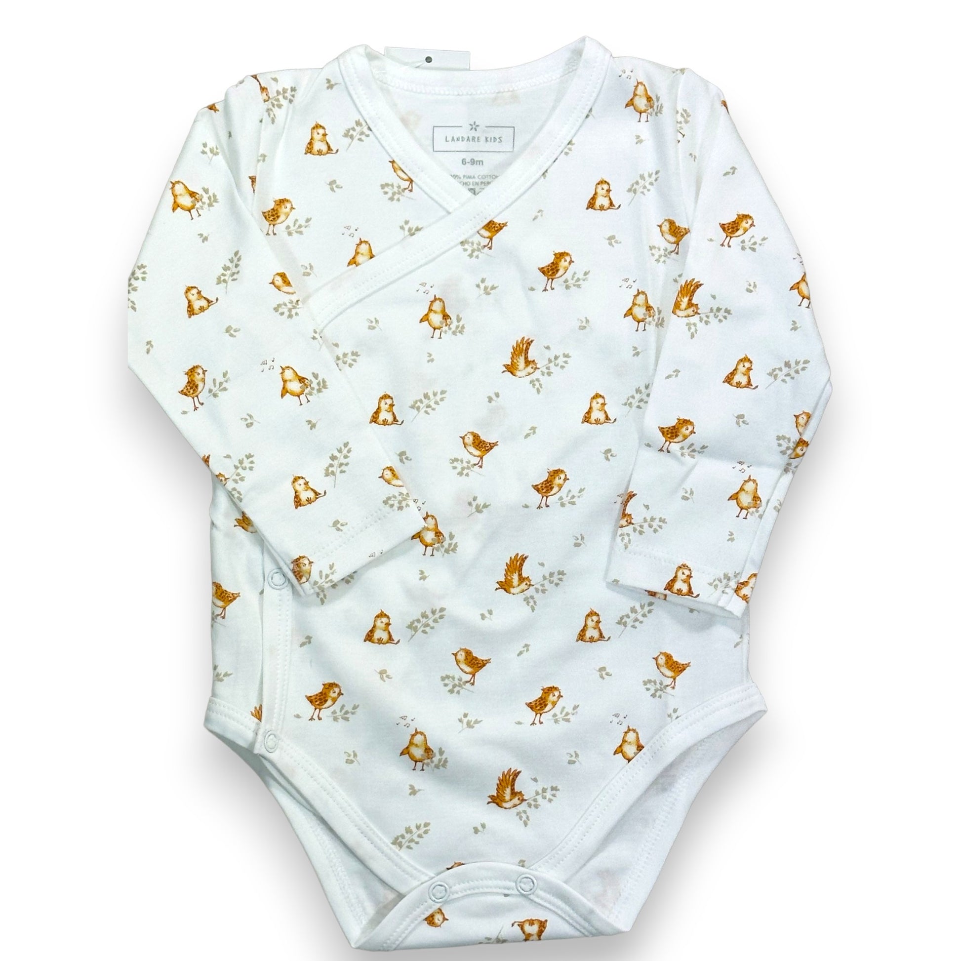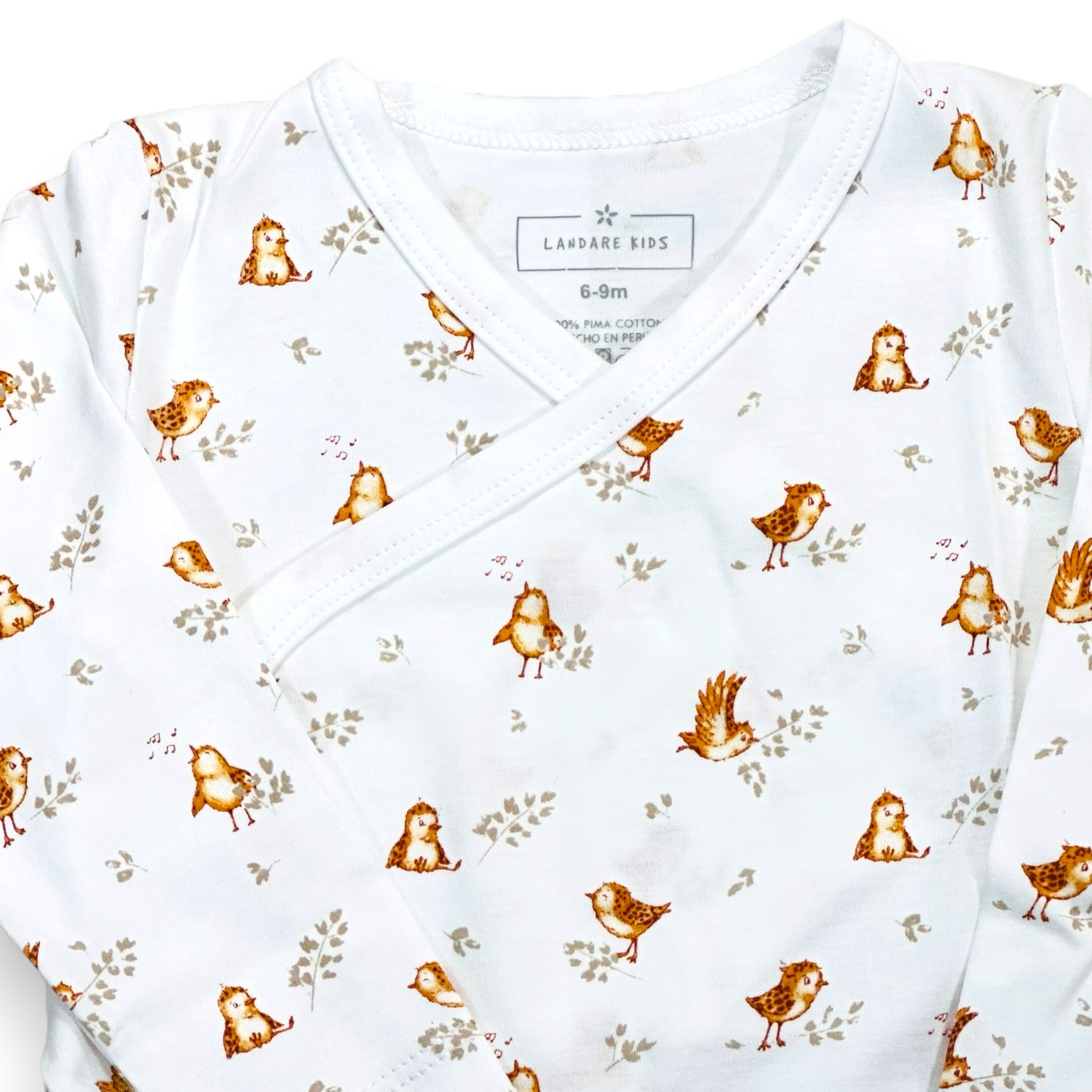 Body cruzado hecho 100% en algodón pima peruano premium estampado con nuestro diseño de pajaritos. Muy suave y cómodo, ideal para guaguas hasta 9 meses.