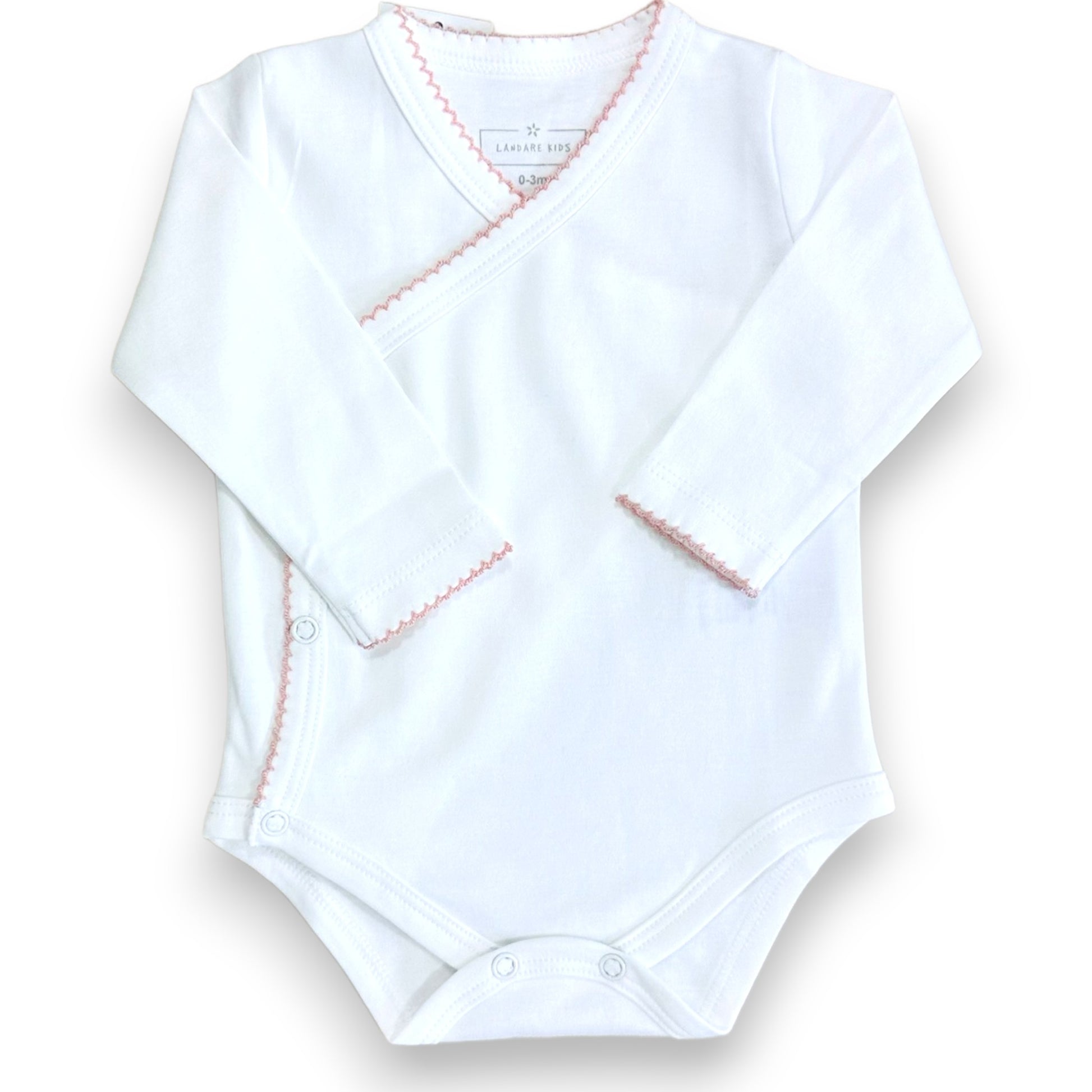 Body cruzado hecho 100% en algodón pima peruano premium con terminación en picueta palo rosa. Muy suave y cómodo, ideal para guaguas hasta 6 meses.