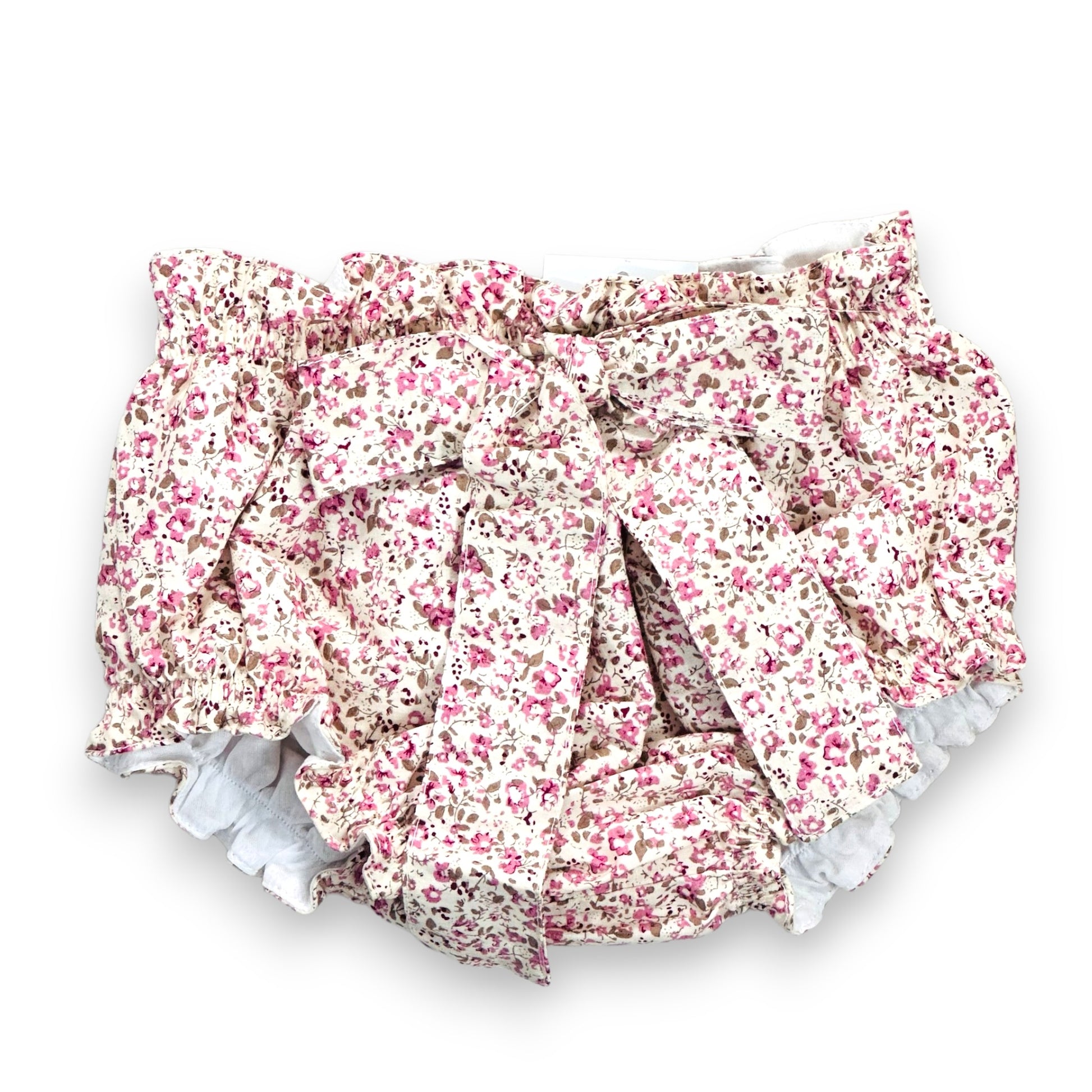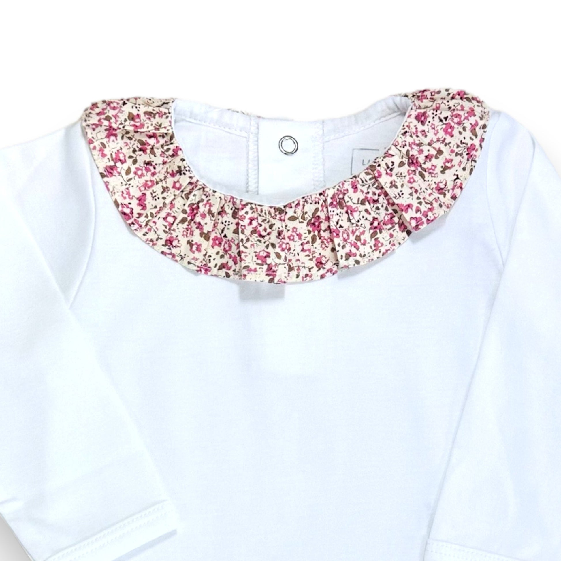 Combina el Body de algodón pima con vuelo floreado Bugambilia Magenta y el cubrepañal del mismo estampado.