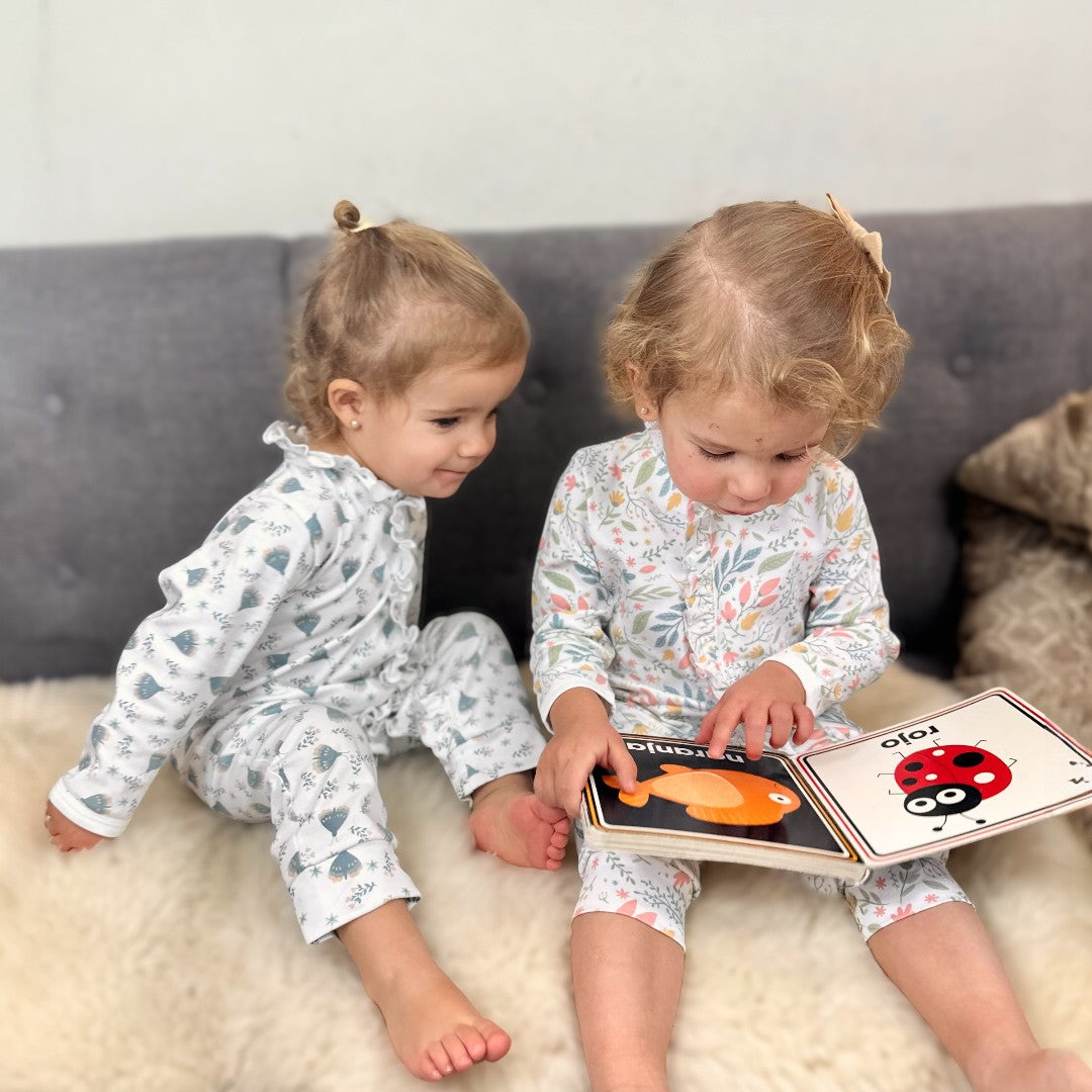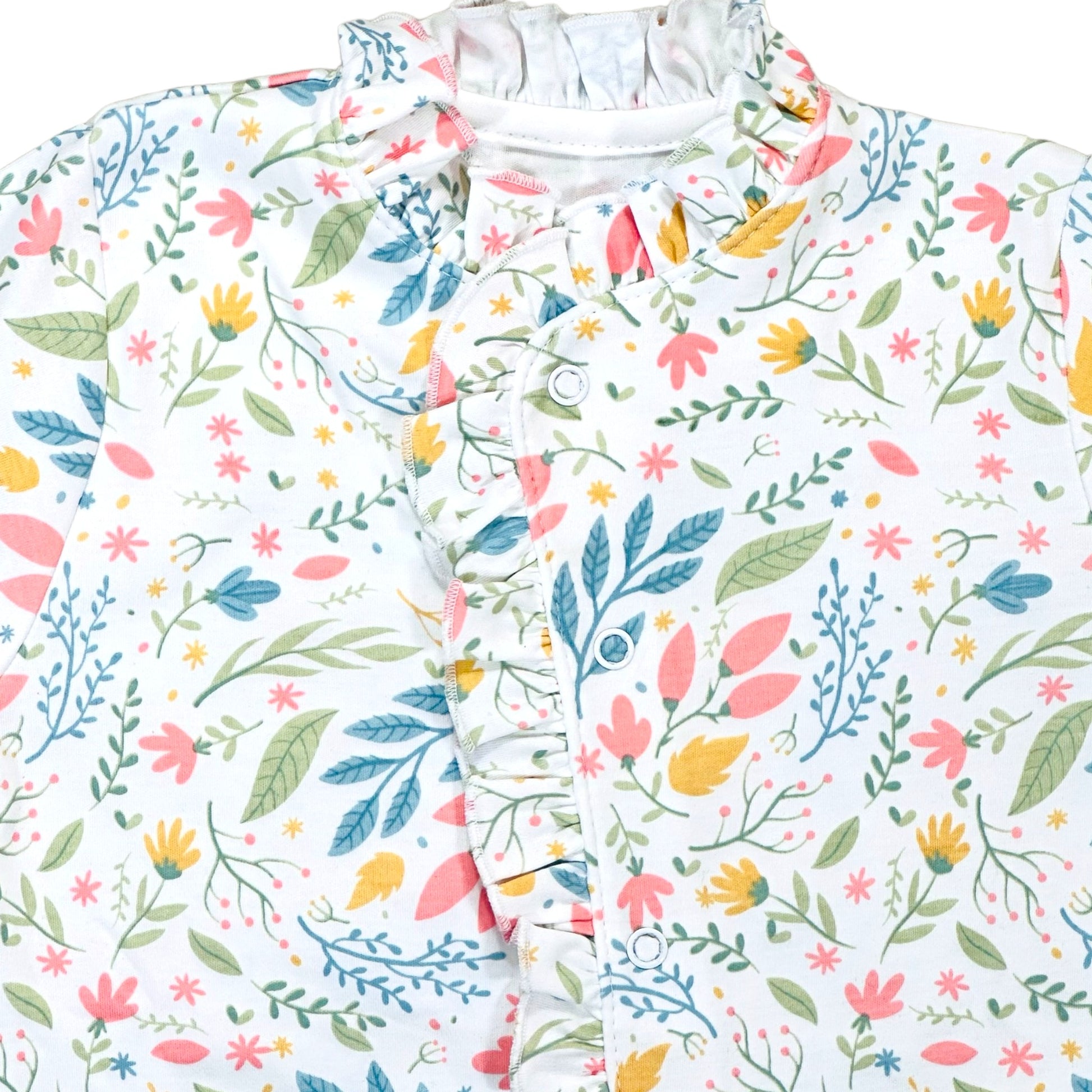 Descubre nuestro lindo y suave enterito con vuelo estampado con diseño floreado. Hecho 100% de algodón Pima peruano premium. Los broches son libres de níquel.