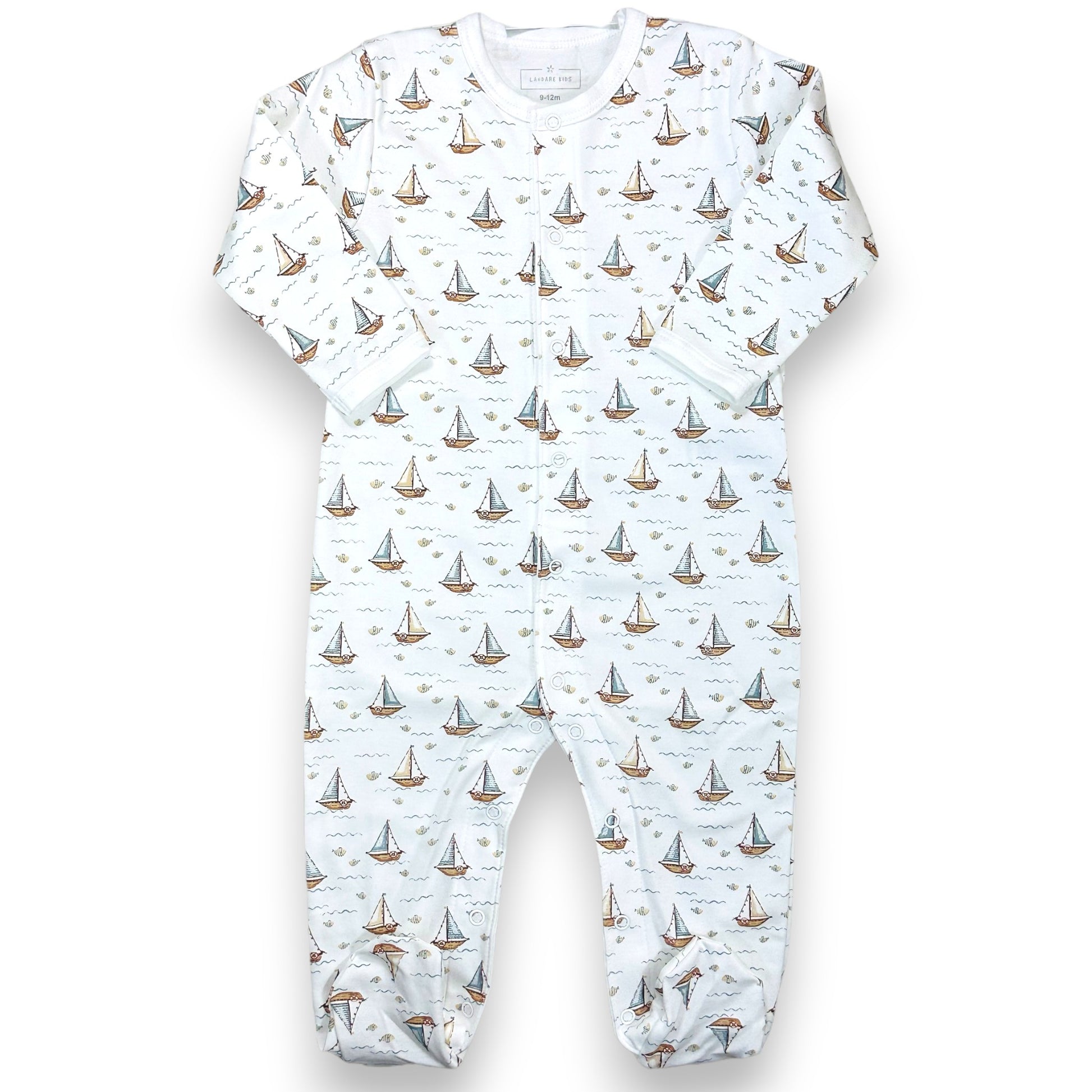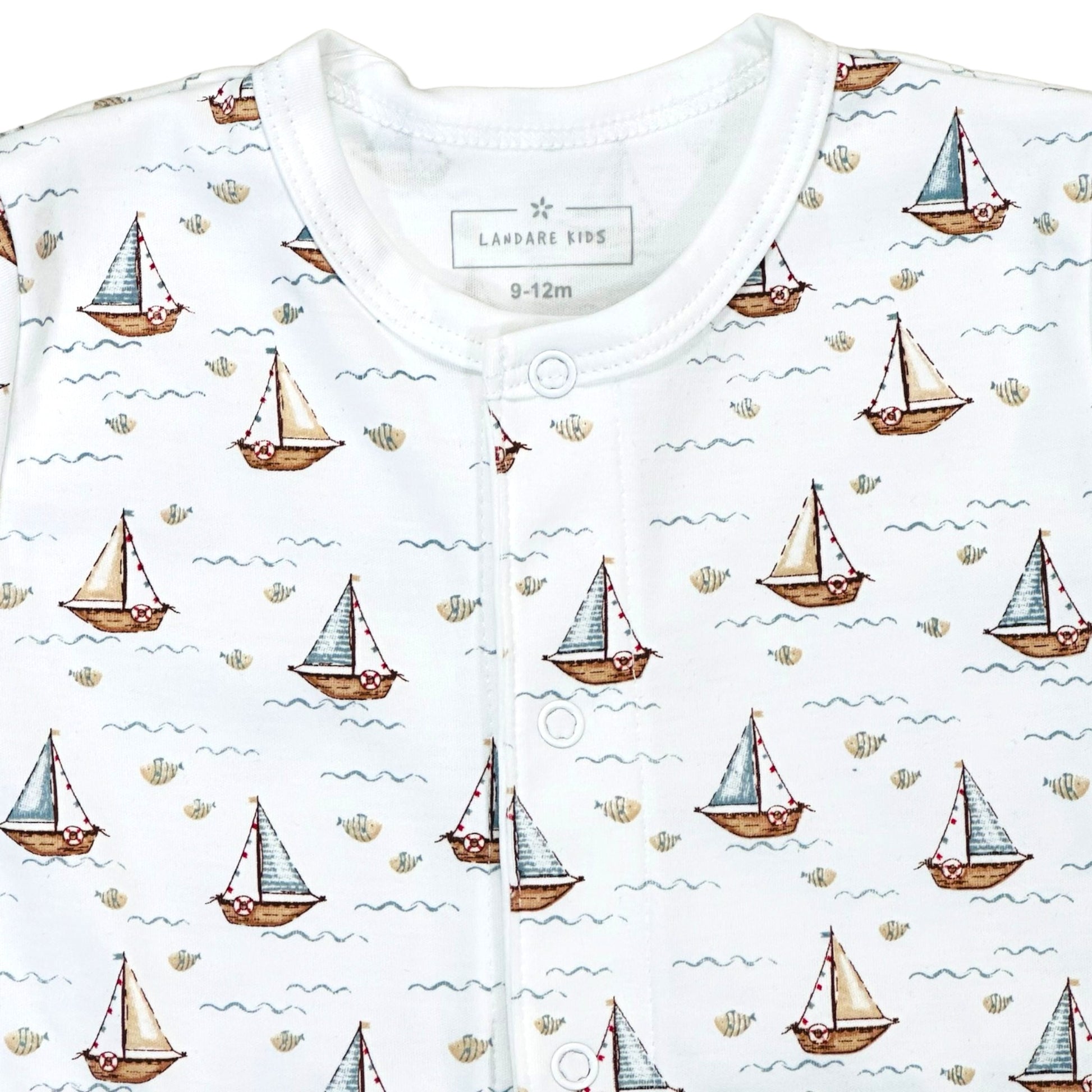 Descubre nuestro lindo y suave enterito con vuelo estampado con nuestro diseño veleros. Hecho 100% de algodón Pima peruano premium. Los broches son libres de níquel.