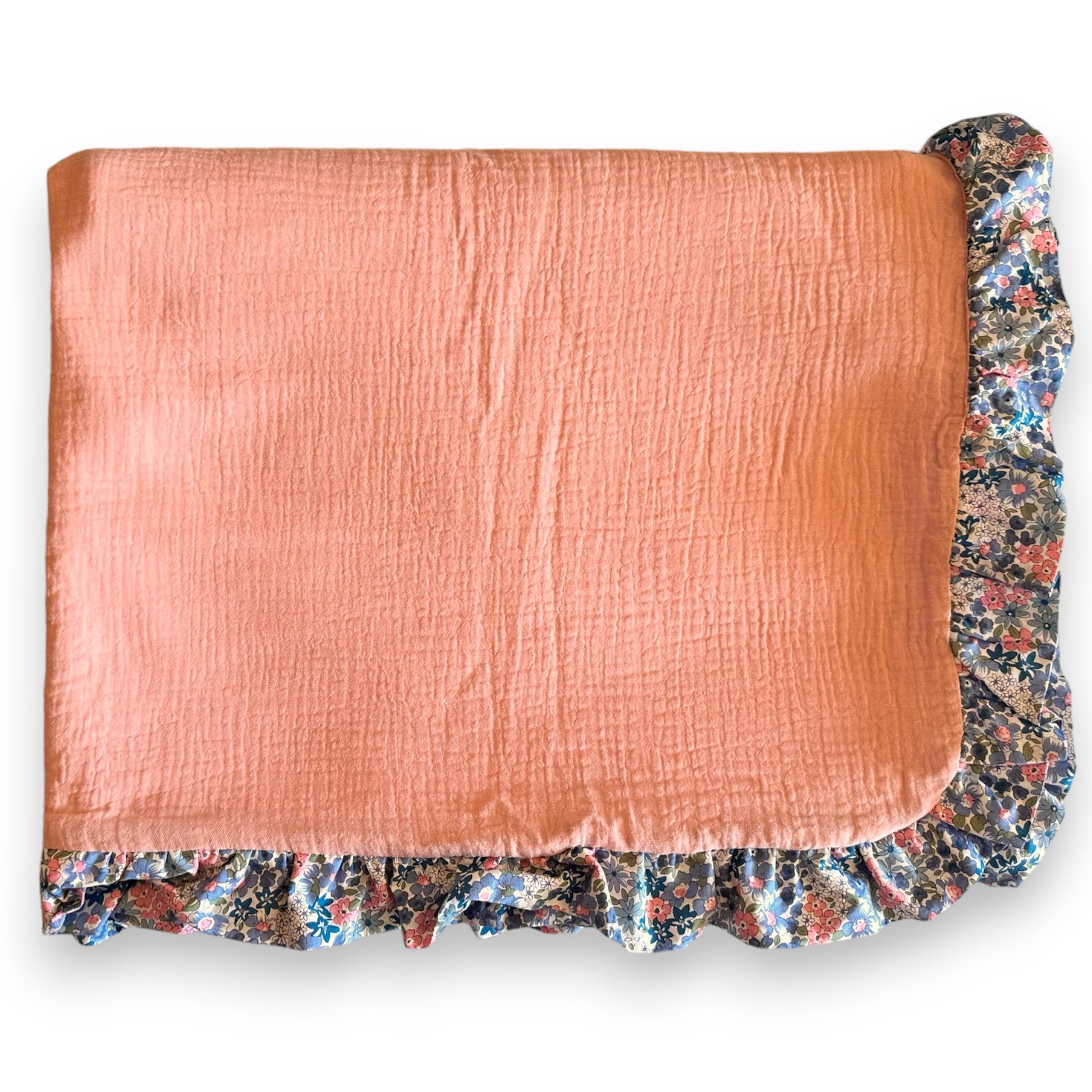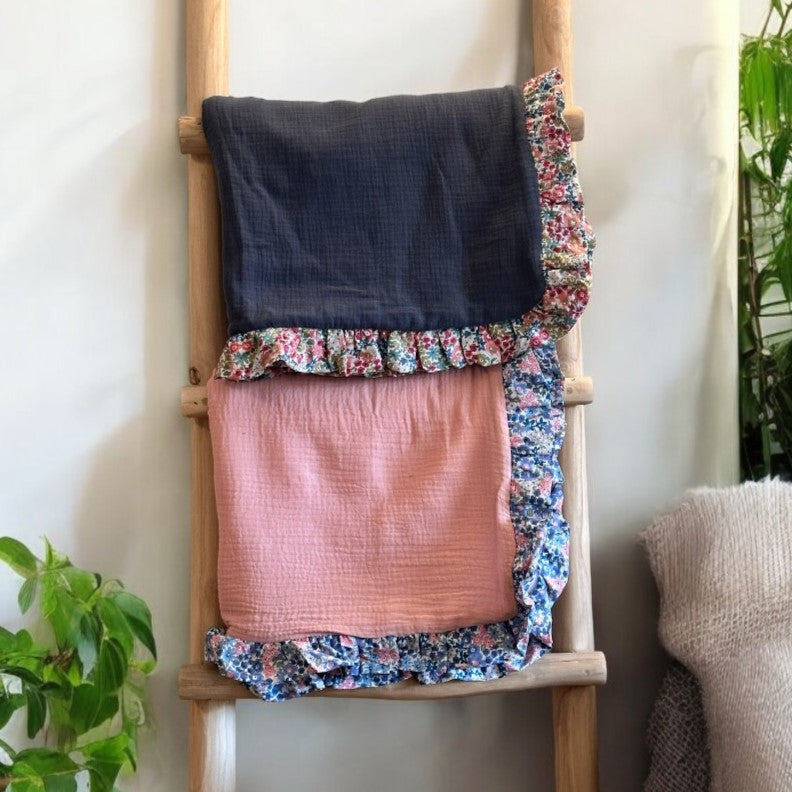 Manta de Muselina rosada con vuelo gardenia azul y micropolar.