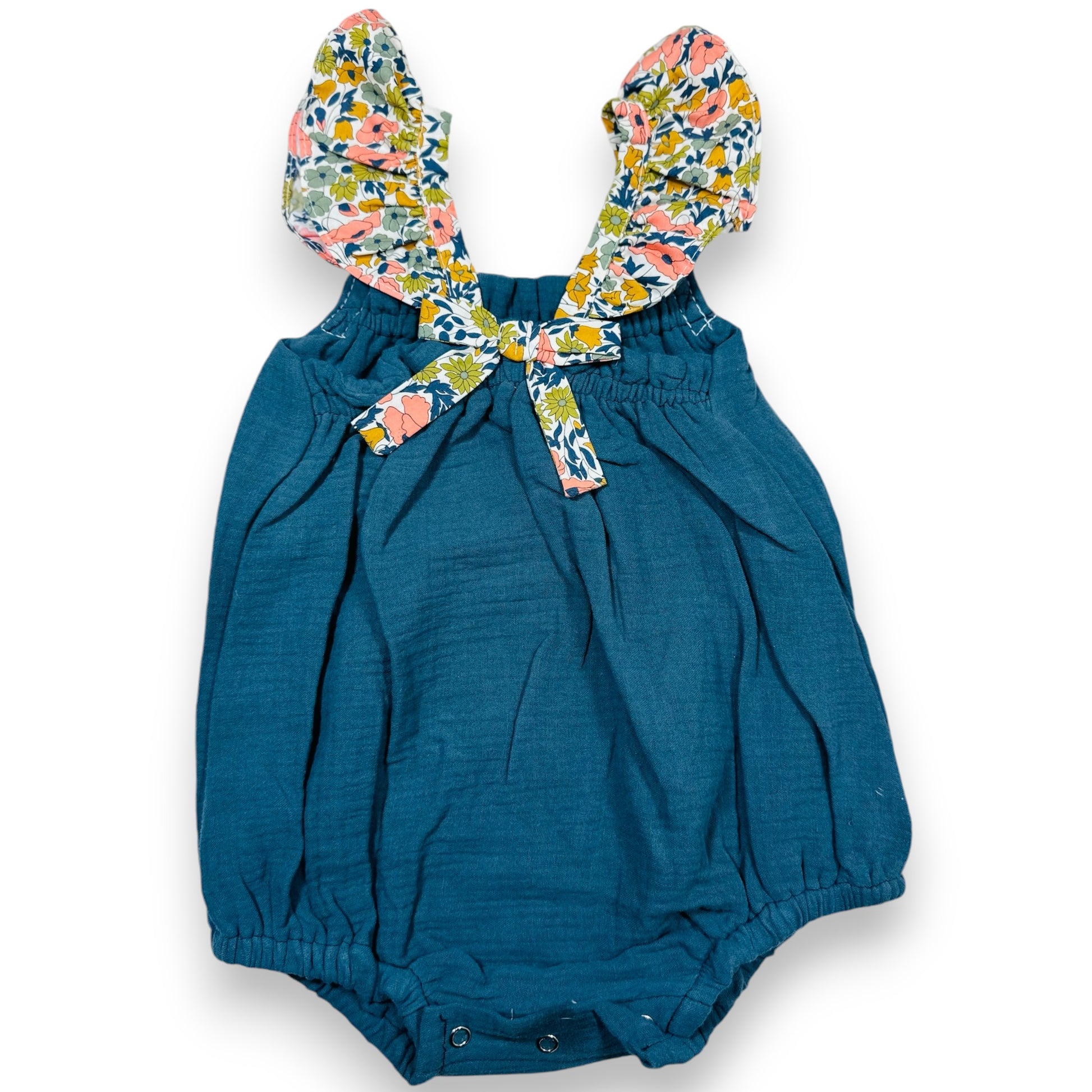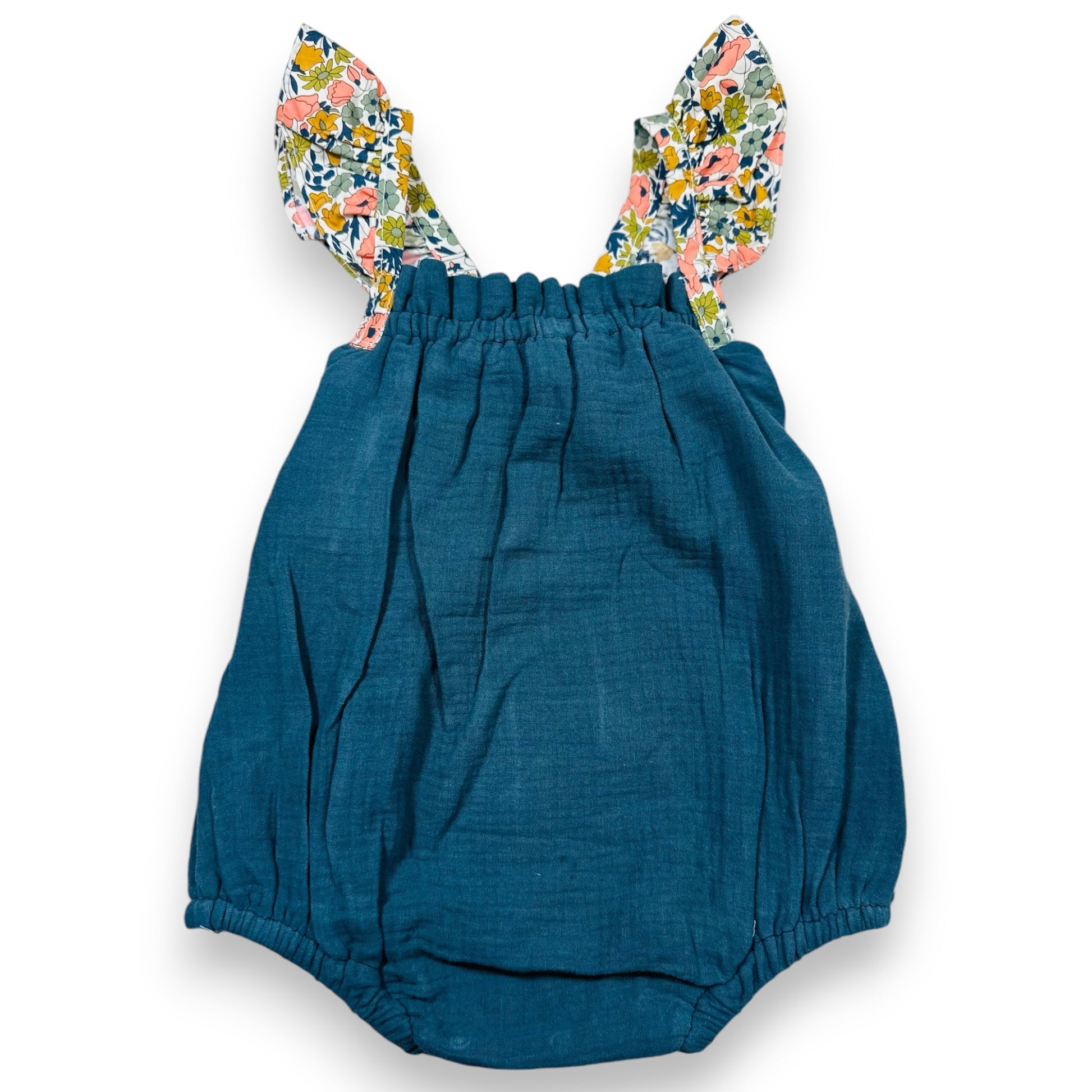 Ranita de muselina de algodón color azul con vuelos estampados con flores menta