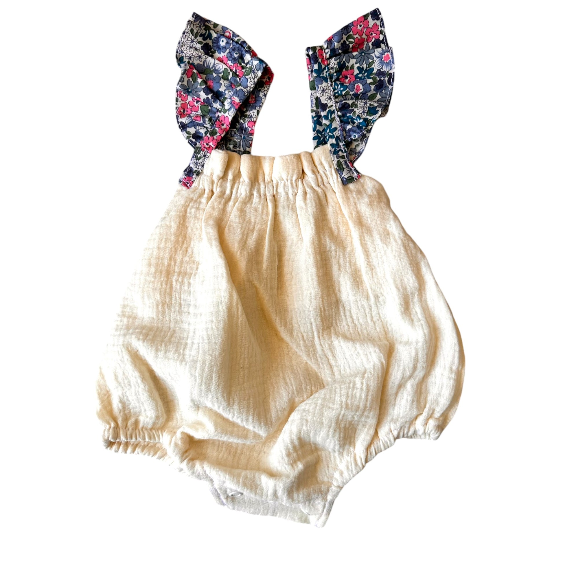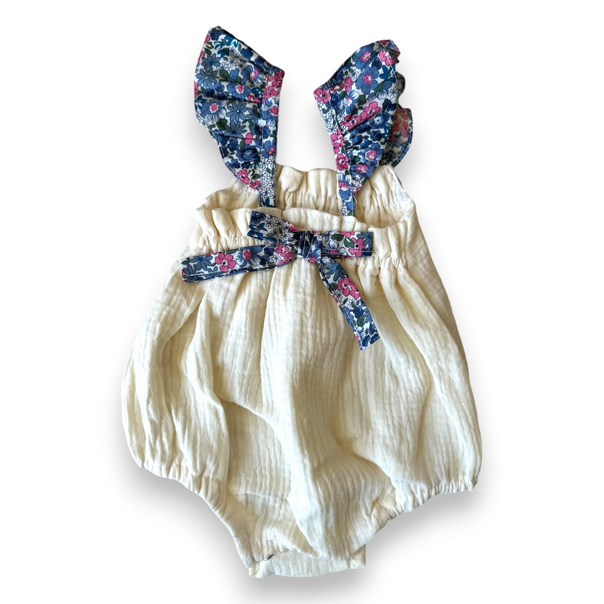Ranita de muselina de algodón color crudo con vuelos estampados Gardenia Azul
