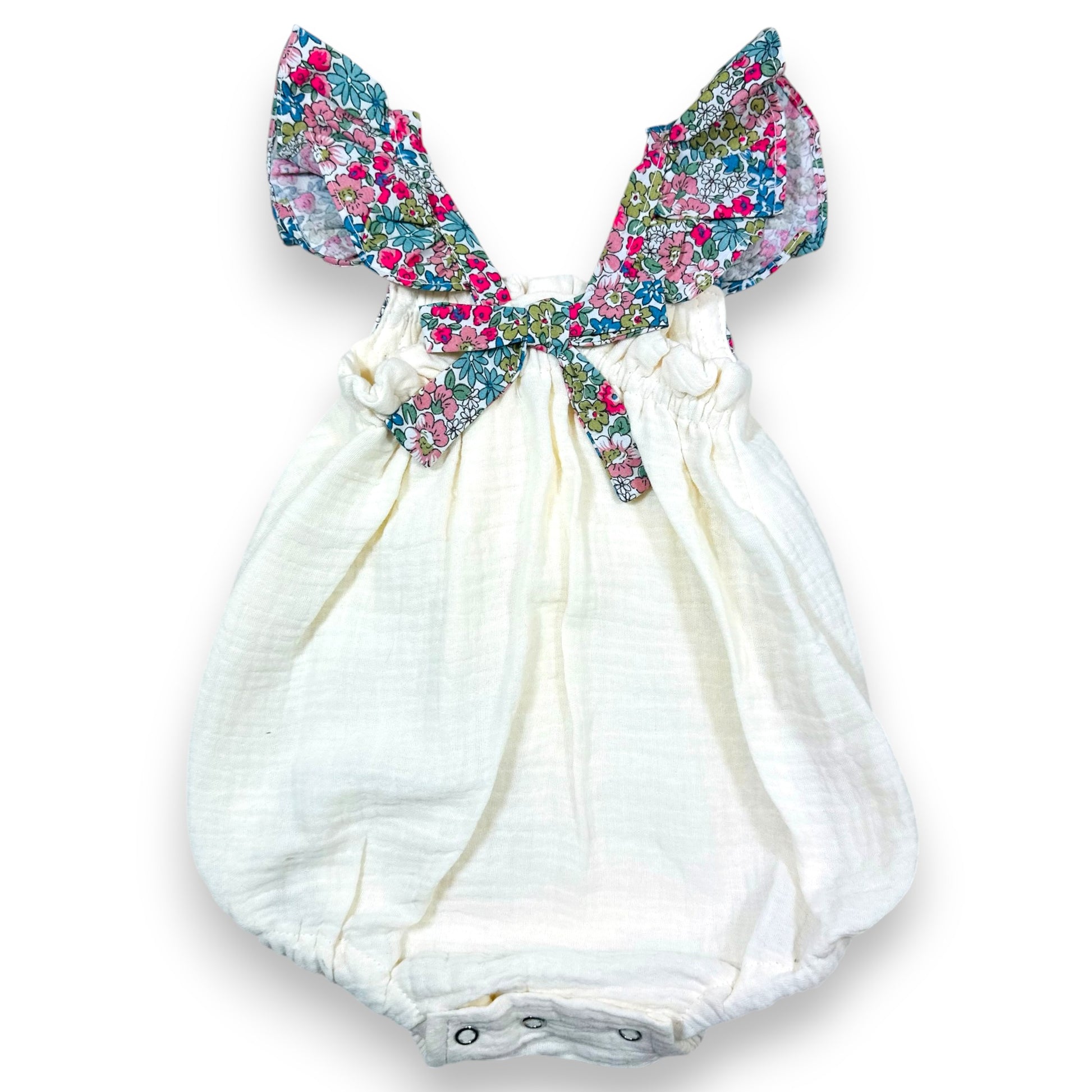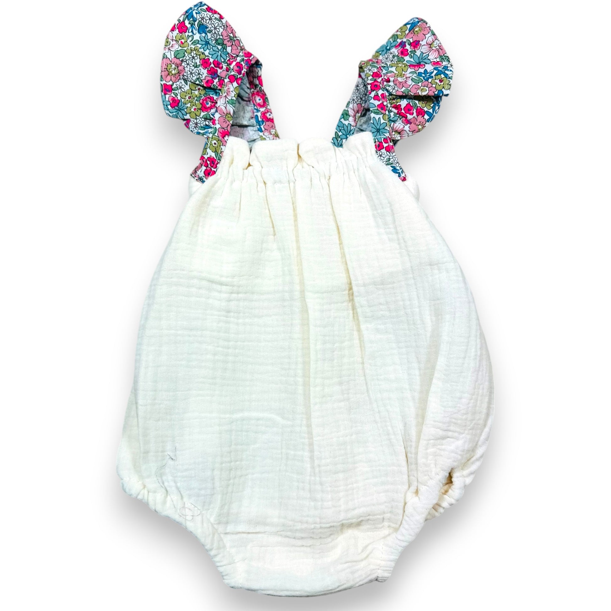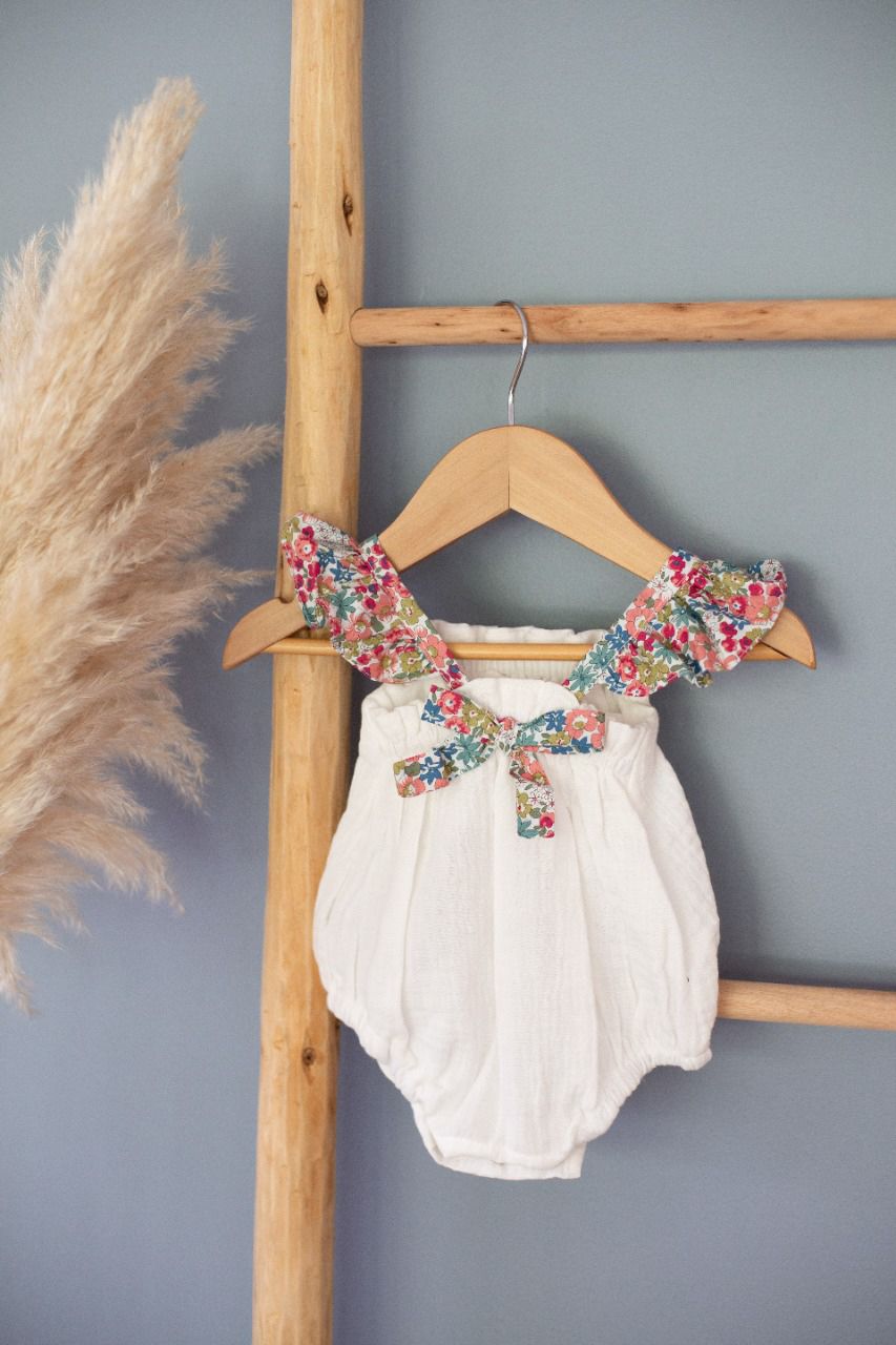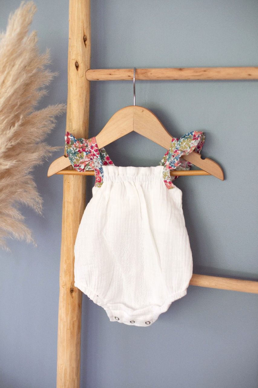 Ranita de muselina de algodón color crudo con vuelos estampados Gardenia Rosa.