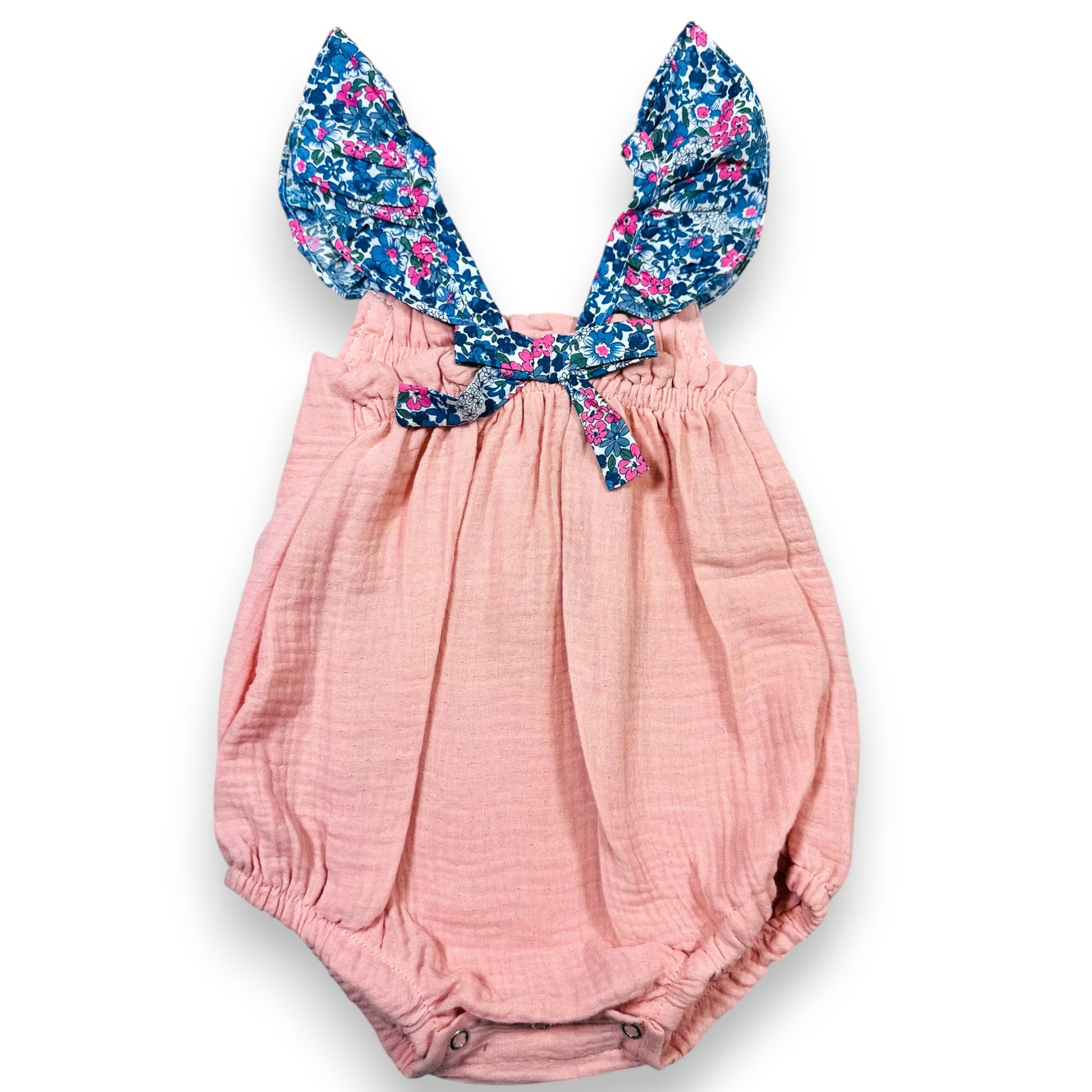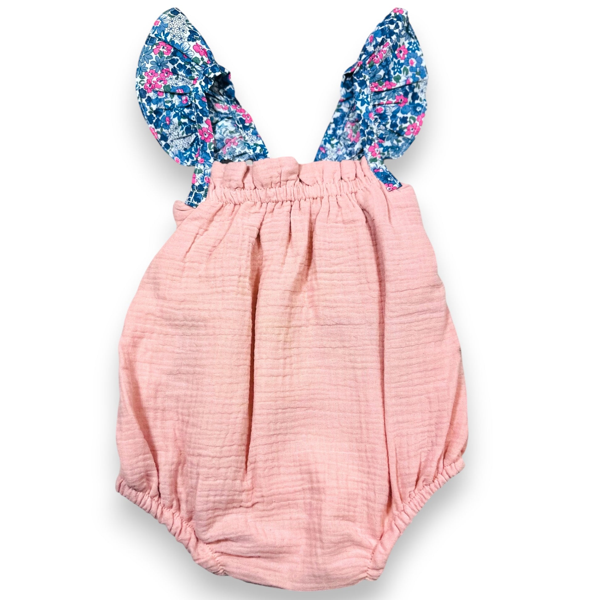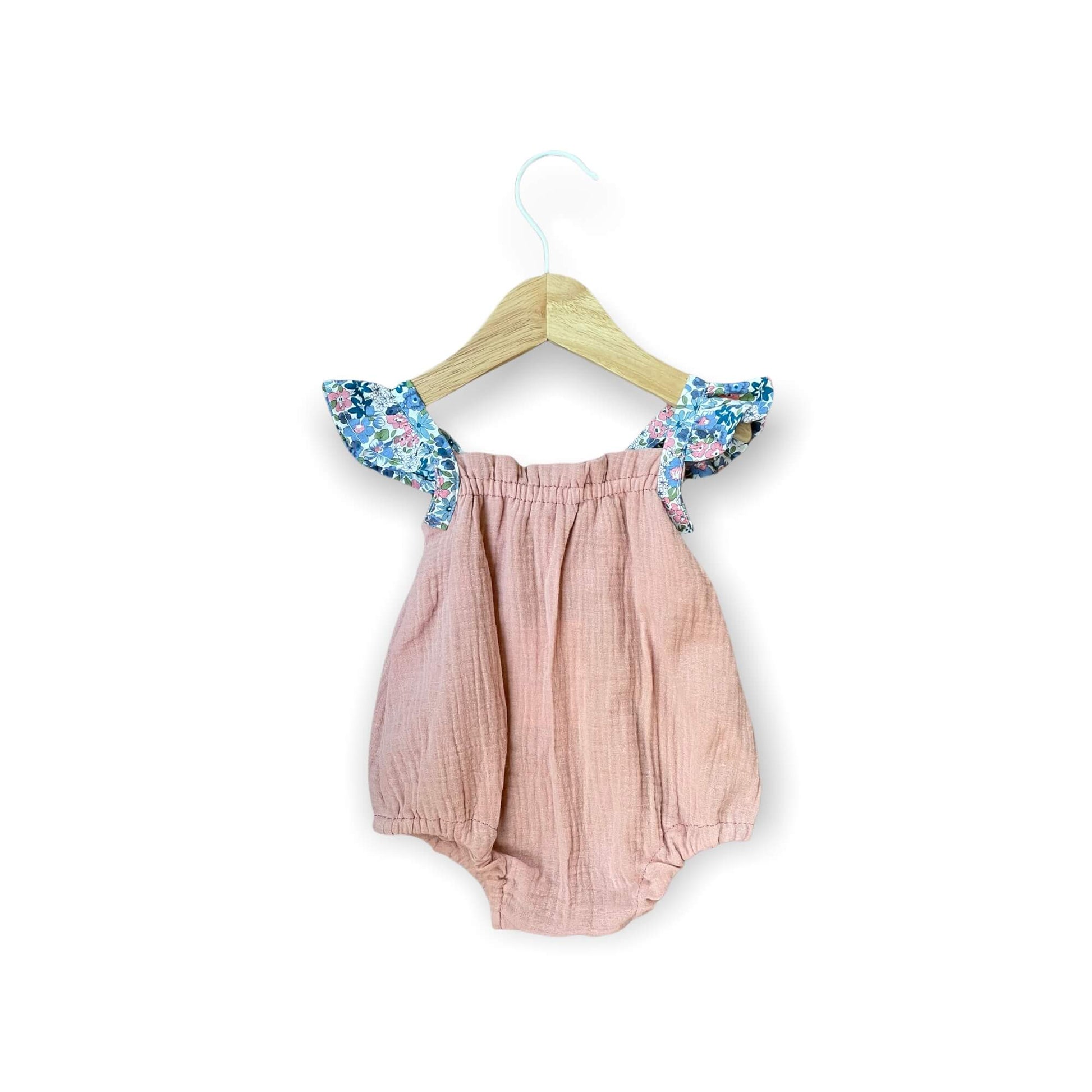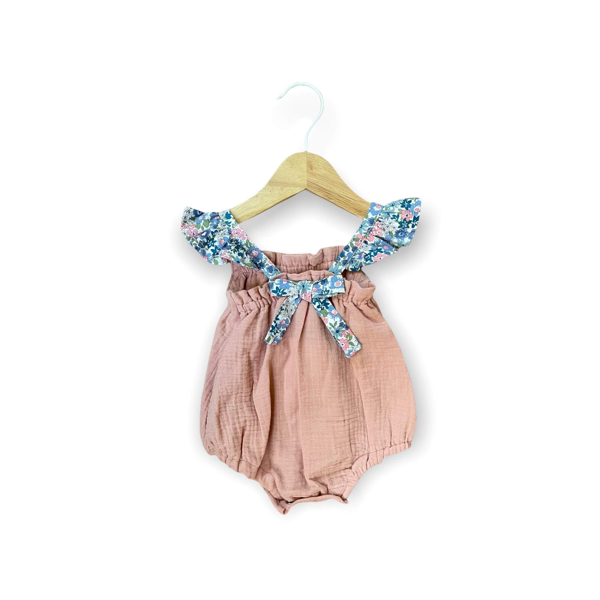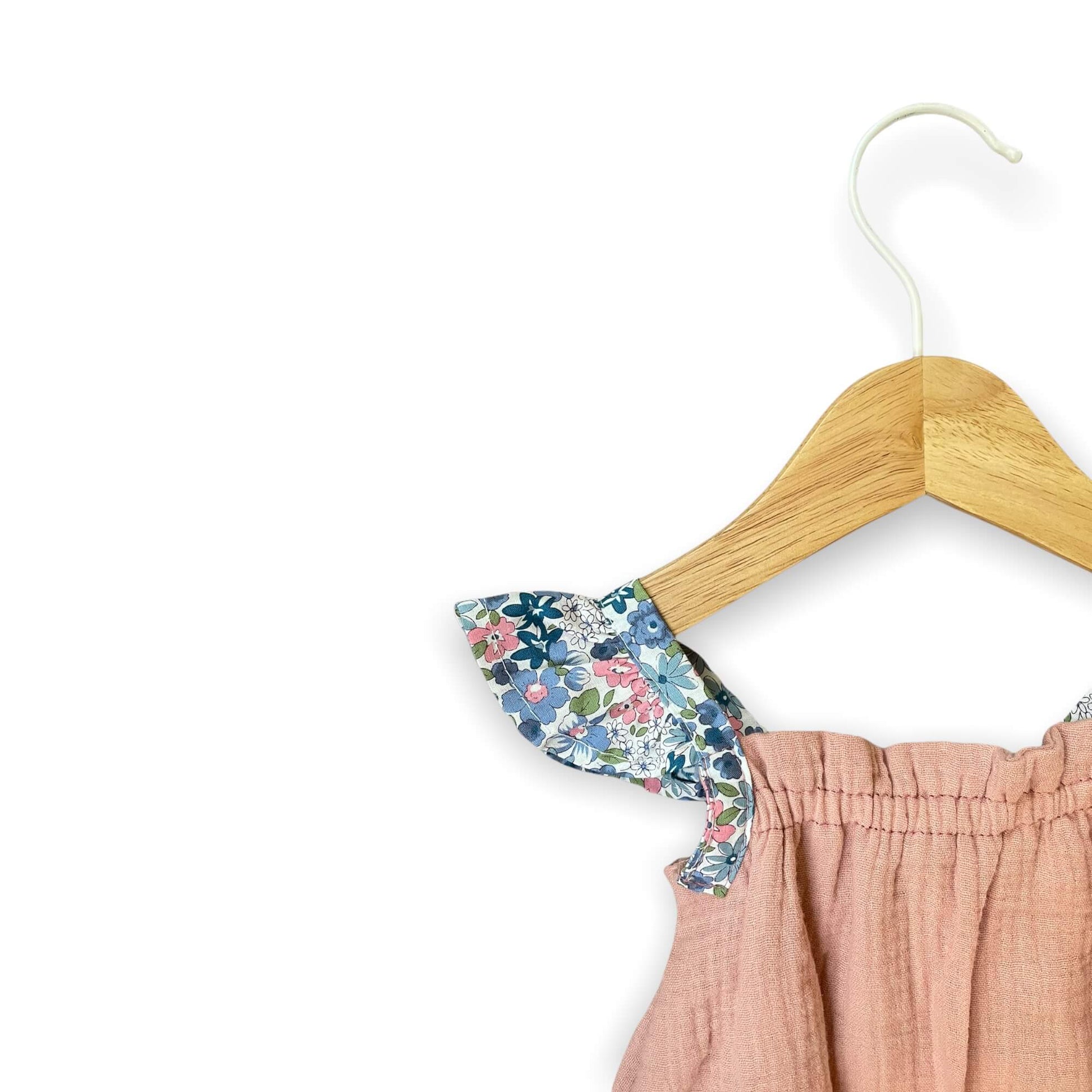 Ranita de muselina de algodón color rosa viejo con vuelos estampados Gardenia Azul.